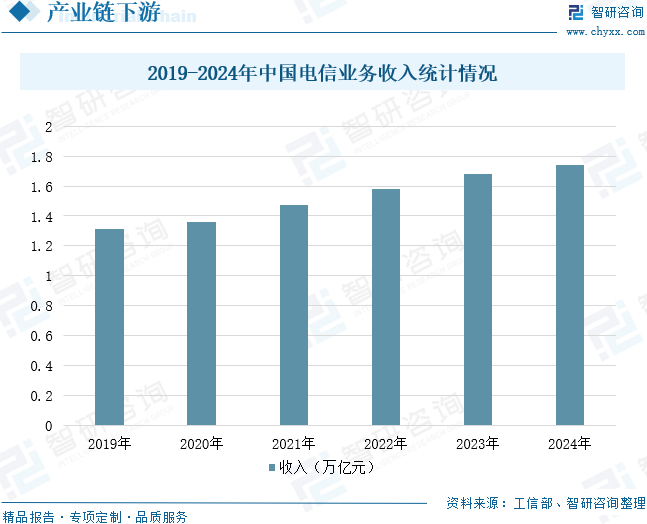 光传输设备在通信领域具有重要的应用价值。它可以实现高速、大容量的数据传输,满足现代通信对带宽的需求。同时,光传输设备还具有较低的信号衰减和抗电磁干扰能力,能够提供稳定可靠的通信服务。近年来,我国通信业实现稳步增长,高质量发展扎实推进,5G、千兆光网等网络基础设施进一步完善,各项应用普及持续深化,为促进实体经济和数字经济深度融合夯实根基,为制造强国、网络强国和数字中国建设注入强大动力。数据显示,2024年中国电信业务收入累计完成1.74万亿元,同比增长3.2%。随着数字中国建设的深入推进,光传输设备产业将迎来更广阔的发展空间,为通信行业高质量发展提供关键支撑。