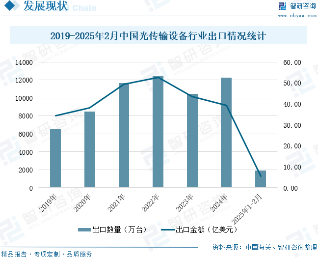 光传输设备行业是现代通信网络的重要组成部分,其核心在于将各种信号转换成光信号,并通过光纤进行长距离、低损耗地传输。近年来,随着5G、物联网、云计算等新兴技术的快速发展,对高速、大容量、低时延的光传输设备需求持续增长。与此同时,随着国内光缆网络持续扩展,光传输设备的应用场景不断丰富,市场规模稳步扩大。在充分满足国内市场需求的同时,我国光传输设备凭借技术优势和成本竞争力,在国际市场上也占据重要地位。中国海关数据显示,2024年中国光传输设备出口量为12281.5万台,同比增长17.22%;出口金额为39.32亿美元,同比下降9.52%。2025年1-2月,中国光传输设备出口量为1915.27万台,同比增长12.48%;出口金额为5.51亿美元,同比下降5.56%。未来,随着“东数西算”等国家战略的深入实施,以及硅光技术、相干传输等前沿领域的持续突破,我国光传输设备产业有望实现从规模扩张向质量提升的战略转型,在全球价值链中占据更有利位置。