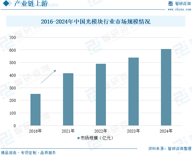 光传输设备的核心部分是光模块,它能够将电信号转换为光信号,并通过光纤传输。光模块是光纤通信系统中完成光电转换的核心部件,主要由光器件、功能电路和光接口组件等组成。近年来,随着生成式人工智能的出现,以ChatGPT为代表的超大算力时代来临,进一步拉动光传输的需s求。云网络对400G和更高速光模块的需求加速,AI驱动光模块往400G/800G/1.6T的高速率技术方向迭代,从而推动光模块及相关器件产品的需求,光模块产业将得到快速发展。数据显示,中国光模块行业市场规模从2016年的250.9亿元增长至2023年的540亿元,年复合增长率为11.57%,2024年中国光模块行业市场规模超600亿元。