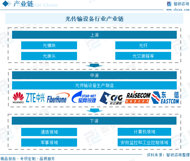 光传输设备产业链上游为原材料,包括光模块,光纤、光接头和光交接箱等。光模块根据不同的传输距离和速率,可以分为短距离传输模块和长距离传输模块。光纤是光信号传输的介质,其内部由高纯度的玻璃或塑料材料构成,能够保持光信号的传输质量。光接头用于连接光纤,保证光信号的传输连接性。光交接箱则用于集中管理和保护光纤连接。产业链中游为光传输设备的生产制造。由于光传输设备具有高带宽、低损耗、抗干扰等优点,因此被广泛应用于通信领域、计算机领域、军事领域、安防监控和工业控制领域。