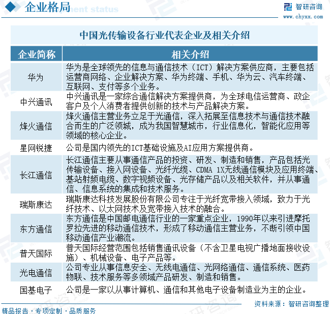当前,中国光传输设备行业代表企业包括华为、中兴通讯、烽火通信、星网锐捷、长江通信、瑞斯康达、东方通信、普天国际、光电通信、国基电子等。