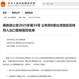 商务部:将8家台湾地区实体列入出口管制管控名单