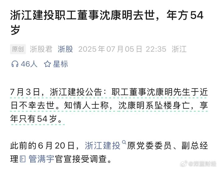 浙江建投职工董事沈康明去世,知情人士称,沈康明系坠楼身亡,享年只有54岁。此前的6月20日,浙江建投原党委委员、副总经理管满宇官宣接受调查。