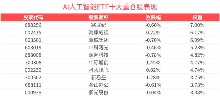 数据显示,截至2025年6月30日,中证人工智能主题指数(930713)前十大权重股分别为中际旭创(300308)、新易盛(300502)、寒武纪(688256)、科大讯飞(002230)、豪威集团(603501)、中科曙光(603019)、海康威视(002415)、澜起科技(688008)、金山办公(688111)、浪潮信息(000977),前十大权重股合计占比52.8%。
