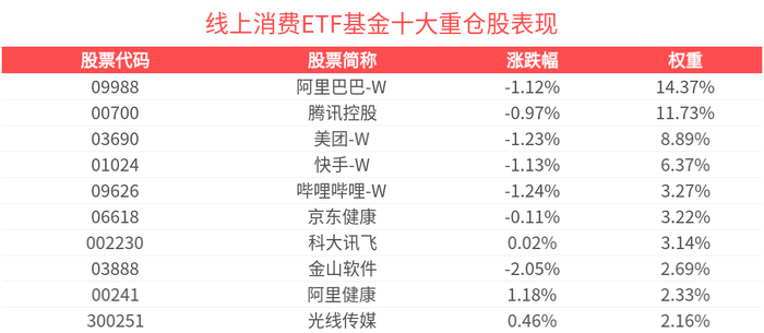数据显示,截至2025年6月30日,中证沪港深线上消费主题指数(931481)前十大权重股分别为腾讯控股(00700)、阿里巴巴-W(09988)、美团-W(03690)、快手-W(01024)、京东健康(06618)、科大讯飞(002230)、哔哩哔哩-W(09626)、金山软件(03888)、恺英网络(002517)、巨人网络(002558),前十大权重股合计占比52.54%。