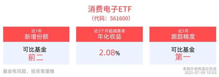 截至2025年7月9日 10:03,中证消费电子主题指数(931494)上涨0.23%,成分股华工科技(000988)上涨6.57%,东山精密(002384)上涨5.62%,生益科技(600183)上涨3.53%,工业富联(601138)上涨2.08%,亿纬锂能(300014)上涨1.75%。消费电子ETF(561600)多空胶着,最新报价0.82元。拉长时间看,截至7月8日,消费电子ETF近1年净值上涨24.86%。