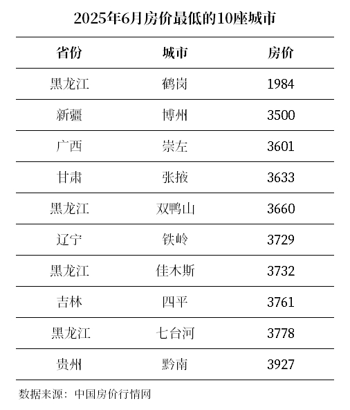 到2025年6月,鹤岗房价为1984元/平方米,依然稳居全国倒数第一。