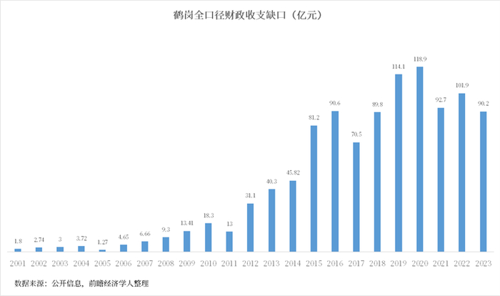 按全口径财政收入/支出计算,鹤岗市2001年财政缺口仅为1.8亿元,到2020年,缺口攀升至118亿元。