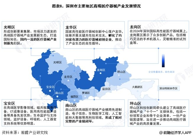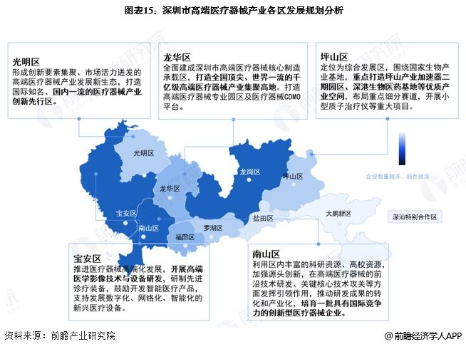 从深圳市高端医疗器械产业区域功能规划来看,南山区作为深圳高端医疗器械产业 “南研发” 的重要区域,目标是成为全球知名的高端医疗器械研发中心的核心组成部分;龙华区和坪山区重点倾向于打造高端医疗器械产业集聚地;宝安区则重点开展高端医学影像技术与设备研发,研制先进诊疗装备,鼓励开发智能医疗产品。