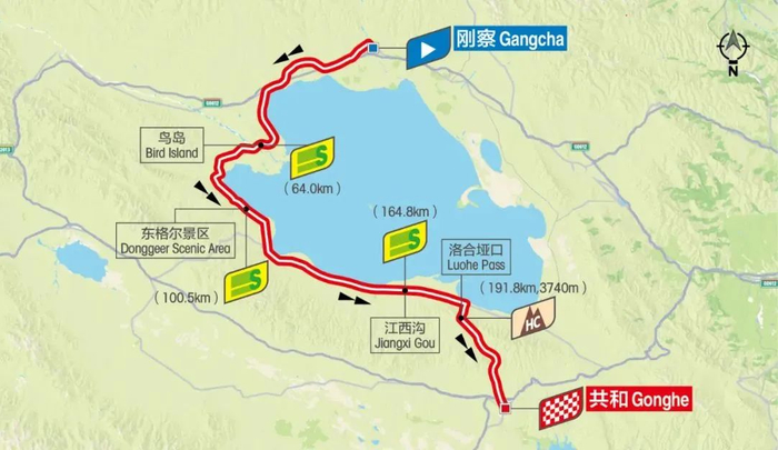 233公里最长赛段,沿青海湖南岸行进,碧蓝的湖水与金黄的草原相得益彰。赛段的大部分路段起伏不大,由于路程很长,集团会长时间暴露在高原草原地带,风向将成为决定比赛的关键因素之一。