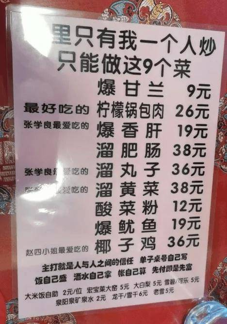 去年,笔者去了一趟东北,印象最深刻的就是物价便宜,那一刻我终于感受了一把“点菜自由”。下图是当时沈阳街边的一个餐馆的菜牌,炒甘兰一份9元,柠檬锅包肉26元,爆香肝19元,爆鱿鱼19元,而且都是份量十足。