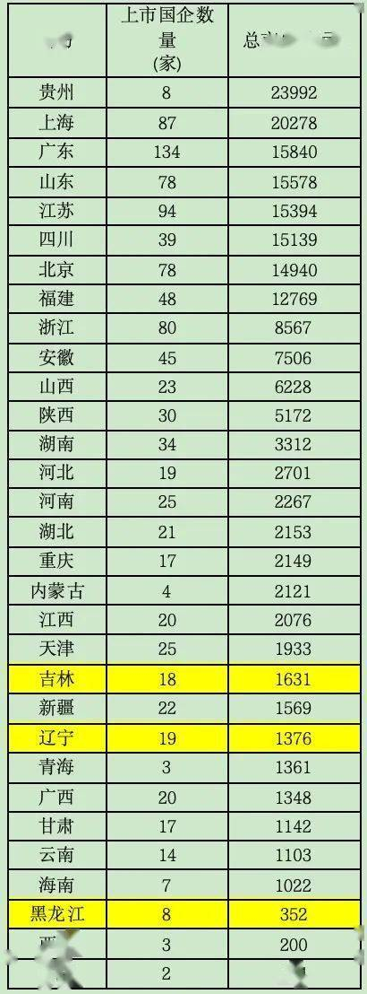 放眼整个东北,连一家千亿市值的国企都没有,可谓是大而不强。上市国企数量也并不算多,吉林18家,总市值1631亿元,位列全国倒数第11。辽宁19家,总市值1376亿元,全国倒数第9。黑龙江只有8家,总市值352亿,全国倒数第3。“共和国长子”昔日的那份荣光,似乎难以再现。