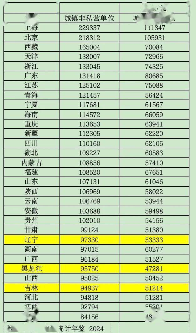 根据中国统计年鉴,2023年,在全国31个省市中,东北三省吉林、黑龙江和辽宁的城镇非私营单位工资分别位列全国倒数第三、第五和第八,城镇私营单位工资则分别位列全国倒数第四、第一和第八。