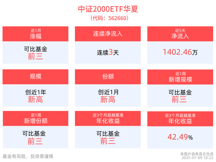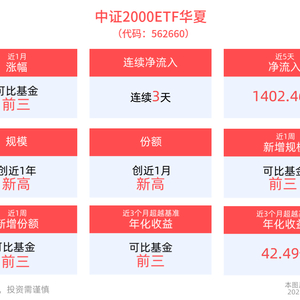 份额方面,中证2000ETF华夏最新份额达1.49亿份,创近1月新高,位居可比基金3/14。