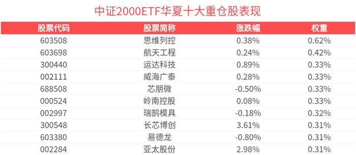 数据显示,截至2025年6月30日,中证2000指数(932000)前十大权重股分别为每日互动(300766)、益方生物(688382)、东土科技(300353)、仕佳光子(688313)、宏创控股(002379)、恒宝股份(002104)、汉威科技(300007)、城地香江(603887)、泰恩康(301263)、华胜天成(600410),前十大权重股合计占比2%。