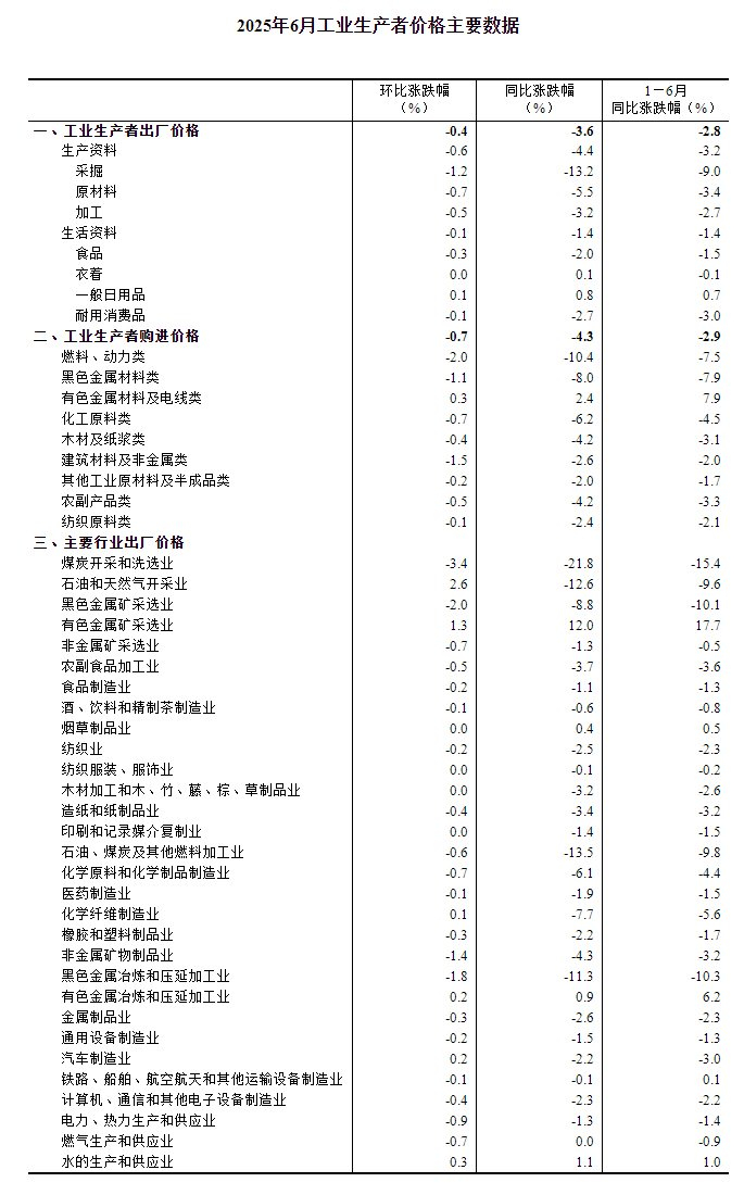 2025年6月份,全国工业生产者出厂价格同比下降3.6%,环比下降0.4%;工业生产者购进价格同比下降4.3%,环比下降0.7%。上半年,工业生产者出厂价格比上年同期下降2.8%,工业生产者购进价格下降2.9%。