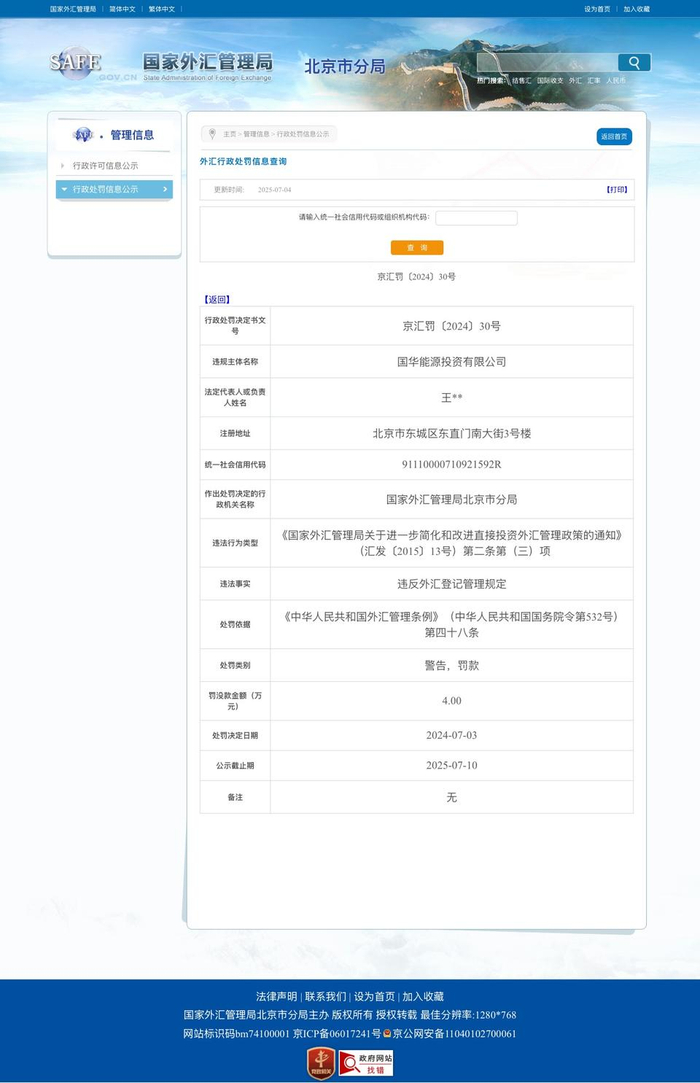 近日, 国家外汇管理局北京市分局公布一则行政处罚决定(文号:京汇罚〔2024〕30号),央企国家能源集团旗下重要子公司——国华能源投资有限公司因违反外汇管理规定受到处罚。