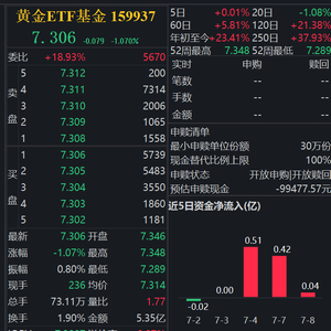 7月9日(周三),受市场情绪影响,黄金ETF基金(159937)早盘呈短期震荡下跌趋势,跌幅1.07%。盘中换手率1.90%,成交金额5.35亿元。