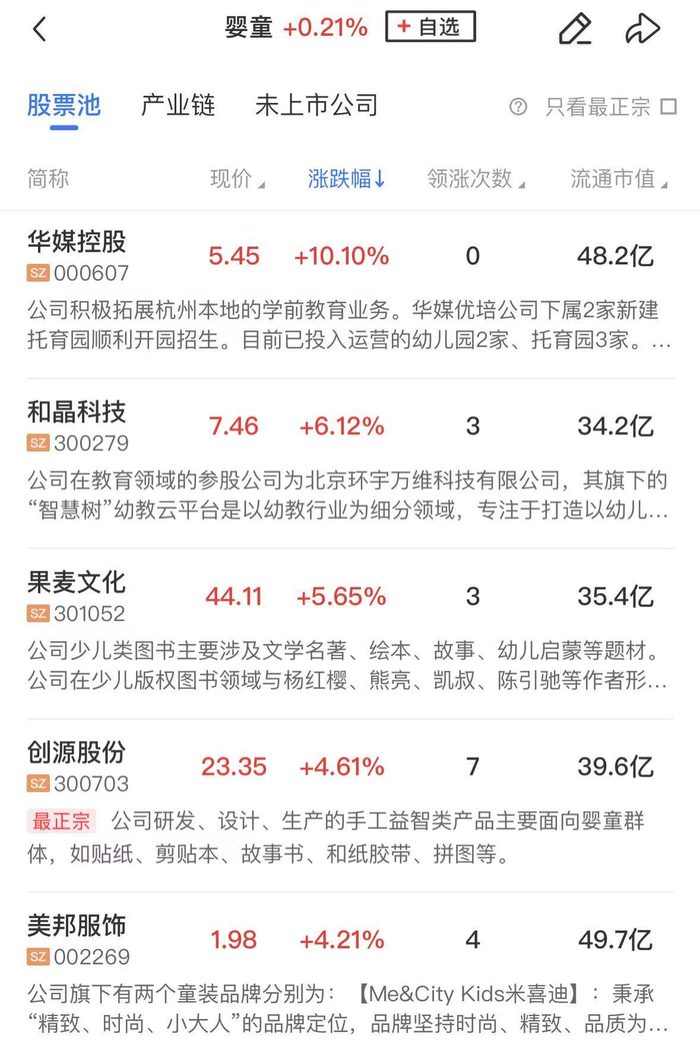 托育服务板块一度活跃,华媒控股涨停,和晶科技、爱婴室、景兴纸业、创源股份、孩子王等跟涨。消息面上,国家发改委等七部门联合发布《关于加快推进普惠托育服务体系建设的意见》,其中提出,支持用人单位利用存量土地或设施规划建设托育服务设施;明确发展“1+N”的托育服务体系。