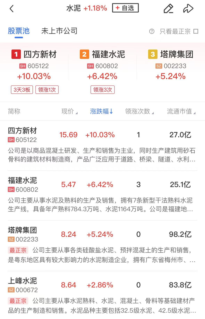 水泥板块同样于盘中冲高,四方新材涨停,福建水泥、塔牌集团、上峰水泥等个股跟涨。