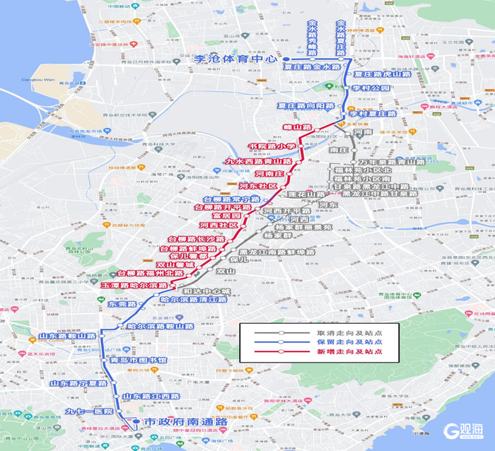 取消站:崂山文化中心(仅下行)、银川东路阳岭路(仅下行)、青岛二中(仅上行)、朱家洼(仅上行)、松岭路苗岭路(仅上行)、苗岭路云岭路(仅上行)。