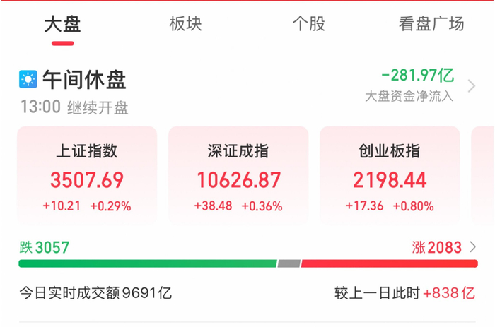 A股三大指数早盘集体上涨,截至午盘,沪指涨0.29%,深成指涨0.36%,创业板指涨0.8%,北证50指数涨0.16%。全市场半日成交额9691亿元,较上日放量838亿元。全市场超2000只个股上涨。