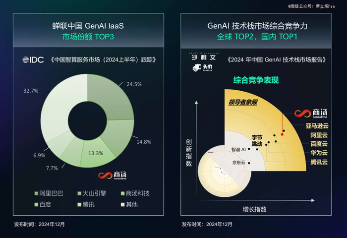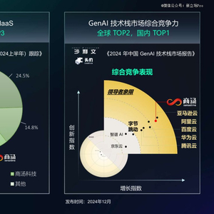 而根据商汤自己的财报引用,商汤在IDC的 GenAI IaaS 2024 上半年的市场份额为TOP3,这一维度的第 一第二分别是阿里巴巴和火山引擎;另外商汤云在沙利文2024年GenAI 技术栈市场综合竞争力为全球TOP2,国内TOP1(全球第 一为亚马逊云,火山引擎此时排国内第六)。
