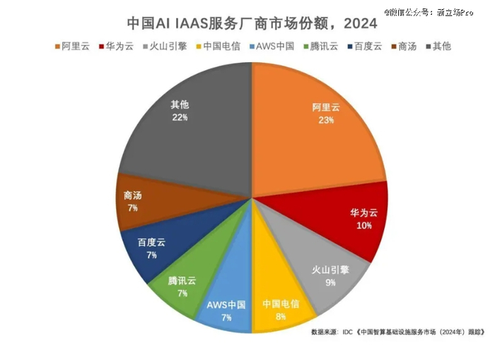 另外根据 7 月 1 日 IDC 的最新报告,2024年全年阿里云AI IaaS市场份额达23%排 名 第 一,华为云占比10%排名第二,火山引擎占比9%排名第三,中国电信占比8%排名第四,腾讯云、百度云和aws中国、商汤占比7%。这也是IDC首次以AI IaaS进行全年数据统计。