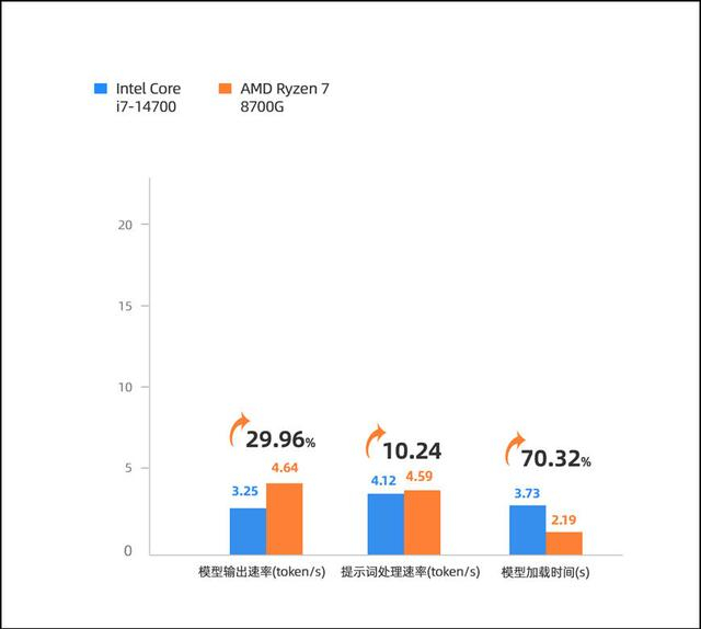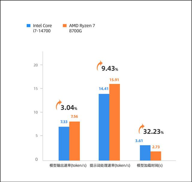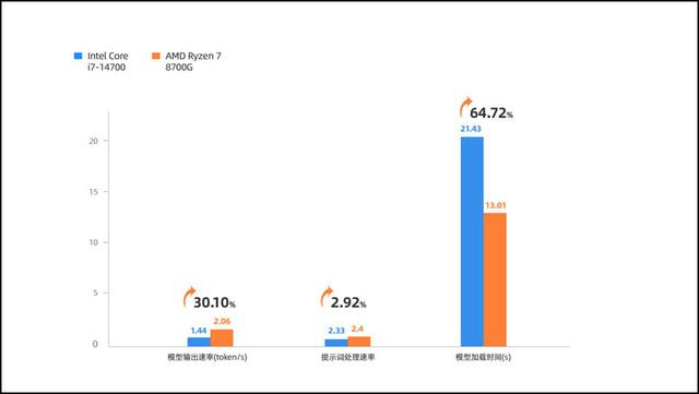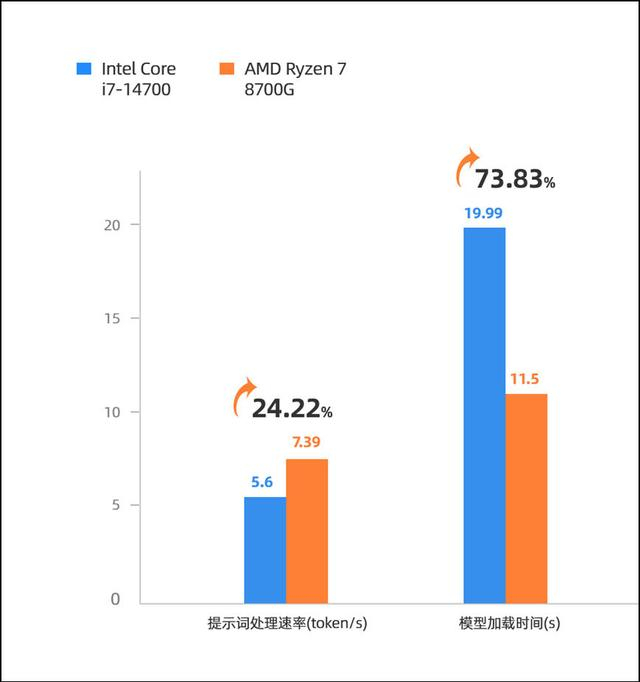 单一任务场景下,锐龙7 8700G加载模型仅需11.5秒,比酷睿i7-14700的19.99秒快42.5%;在指令处理速率上,前者以7.39 token/s领先于对手的5.6 token/s,优势达32%。