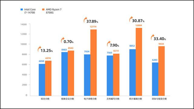 在视频会议等高频任务中,锐龙7 8700G得分8543,酷睿i7-14700得分8483,两者性能相当。在文档编写环节,锐龙7 8700G凭借8214分,领先酷睿i7-14700的7565分达7.90%,这意味着在处理图文混排的复杂文档时,前者响应更为敏捷。