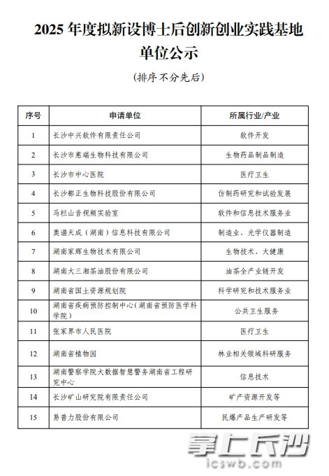 长沙晚报掌上长沙7月9日讯(全媒体记者 刘攀)记者今日从湖南省人力资源和社会保障厅获悉,经专家综合评议,拟确定长沙中兴软件有限责任公司等15家单位设立博士后创新创业实践基地,公示持续至11日。