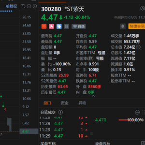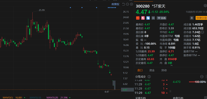 A股异动丨*ST紫天再度20cm跌停 股价创新低 年报“难产”退市风险加剧