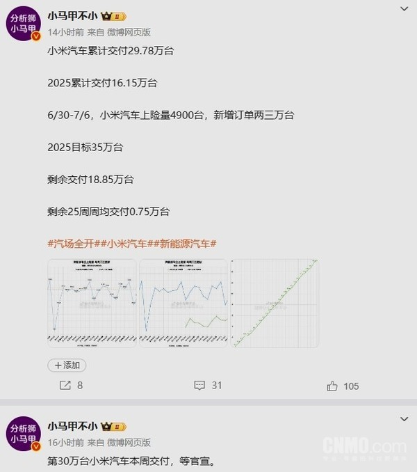 CNMO注意到,小米汽车在2025年的表现持续强劲。最新数据显示,6月30日至7月6日这一周,小米汽车的上险量为4900台,在中国造车新势力品牌中排名第五 。同时,该周新增订单超2万台,显示市场需求旺盛 。