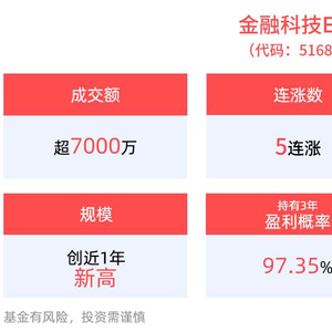 截至7月8日,金融科技ETF近1年净值上涨130.77%,指数股票型基金排名2/2901,居于前0.07%。从收益能力看,截至2025年7月8日,金融科技ETF自成立以来,最高单月回报为55.92%,最长连涨月数为3个月,最长连涨涨幅为113.16%,上涨月份平均收益率为10.60%,年盈利百分比为66.67%,历史持有3年盈利概率为97.35%。截至2025年7月8日,金融科技ETF成立以来超越基准年化收益为0.51%。