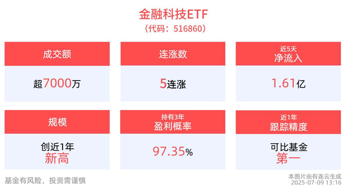截至2025年7月9日 13:13,中证金融科技主题指数(930986)上涨0.38%,成分股大智慧(601519)上涨10.04%,信雅达(600571)上涨10.01%,金证股份(600446)上涨8.62%,京北方(002987)上涨8.50%,中亦科技(301208)上涨7.28%。金融科技ETF(516860)上涨0.21%, 冲击5连涨。最新价报1.45元。拉长时间看,截至2025年7月8日,金融科技ETF近1周累计上涨3.67%。