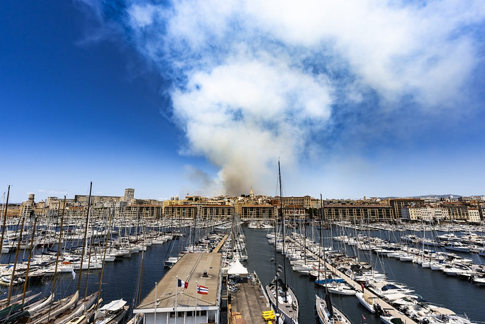 当地时间2025年7月8日,法国马赛,马赛北部佩讷米拉博地区山丘发生火灾, Vieux-Port(老港)可见浓烟。每年,该地区都受到火灾的严重影响,干燥的天气和强风助长了火势的蔓延。这些火灾通常由人类活动引起;此次火灾是由一辆汽车引发的。