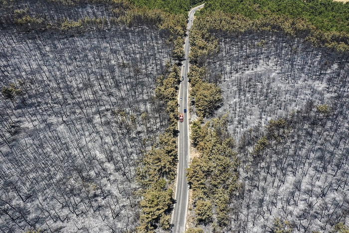 当地时间2025年7月5日,土耳其伊兹密尔,布贾区,航拍林火被扑灭后的景象。该林火通过陆空联合干预措施得以扑灭。