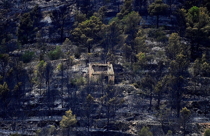 当地时间2025年7月8日,西班牙加泰罗尼亚地区塔拉戈纳附近,保尔斯,森林火灾中被烧毁的房屋。加泰罗尼亚地区消防部门表示,超过450名消防员在直升机和飞机的支援下,在塔拉戈纳东北部省份30公里的山区前线展开部署。