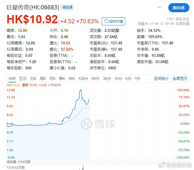 7月9日,受此消息影响,多只与周杰伦相关的概念股大涨。港股巨星传奇(06683.HK)盘中放量大涨100%,截至午间收盘该股涨70.63%,报10.92港元/股,总市值93.88亿港元。