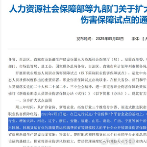 据新华社报道,人力资源社会保障部8日发布消息,扩大新就业形态人员职业伤害保障(以下简称“新职伤”)试点。自7月1日起,在原有试点的7个省份、7家平台企业基础上,新增10个省份和滴滴出行、顺丰同城、滴滴货运、满帮省省等平台企业。