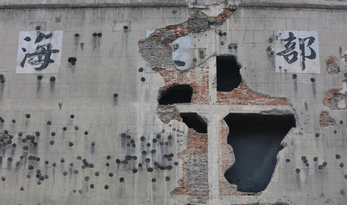 上海苏州河北岸,光复路1号至21号,四行仓库抗战纪念馆的西墙上,抗日战争期间留下的累累弹痕,格外触目。