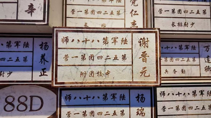 纪念馆三楼,整整两面墙上,镌刻着一个个名字,浮动在观众眼前。“这是当年‘八百壮士’的名字,许多从战争中的幸存老兵,这几年也相继‘归队’了。”谢骏说。