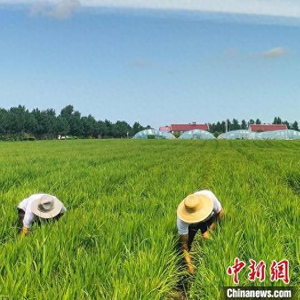 图为五道河子农牧专业合作社农人正在稻田里进行除草工作。 王天茹 摄