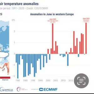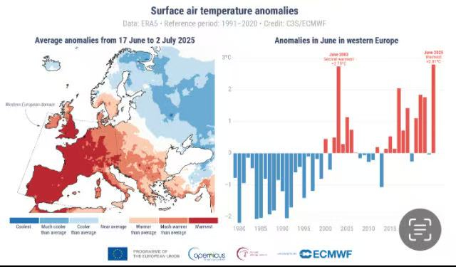 欧洲中期天气预报中心气候战略负责人伯吉斯(Samantha Burgess)表示:“2025年6月,西欧大部分地区遭遇异常热浪袭击,该地区中的大部分经历了非常强烈的热应力。地中海西部创纪录的海面温度使这股热浪更加猛烈。在全球变暖的背景下,热浪可能会变得更加频繁、更加强烈,并影响到欧洲更多的人。”