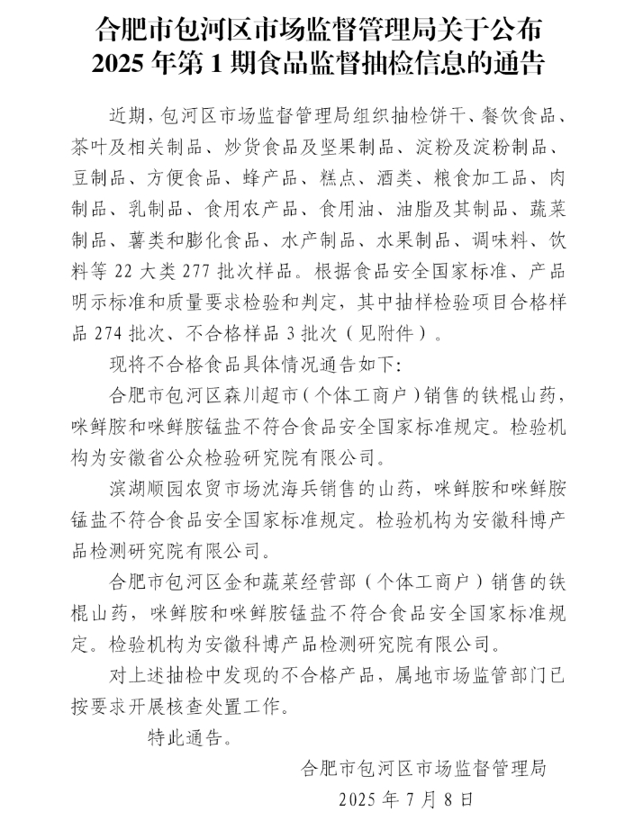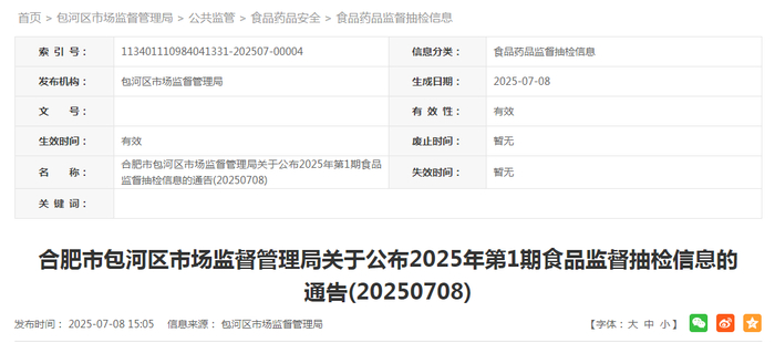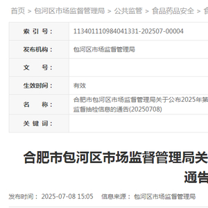 合肥市包河区市场监督管理局关于公布2025年第1期食品监督抽检信息的通告(20250708)