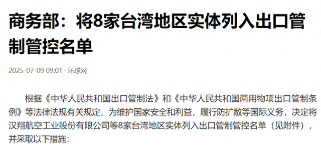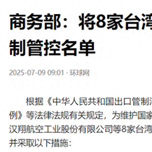 7月9日一大早,商务部就发布公告,将8家台湾地区实体列入出口管制管控名单,禁止向它们出口两用物项。