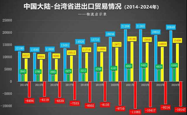 2024年大陆对台湾地区出口5350亿元,进口15498亿元,贸易逆差额达到10147亿元。大陆是台湾最大贸易顺差来源地,占其顺差额的86.8%,也就是说台湾地区基本上赚的就是大陆的钱。