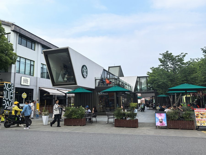 园区最出圈的集装箱店,是2020年9月开业的星巴克。这也是星巴克中国大陆首家集装箱店,刚一开业就引来一拨拨游客打卡。设计师以“箱”为主体,用六个大小不一的集装箱创意拼搭,通过不同角度、高度的堆叠来产生一些架空、露天阳台、走廊等空间。旁边还种了不少樱花树,记者在樱花季前去采访,也拍了不少美照。