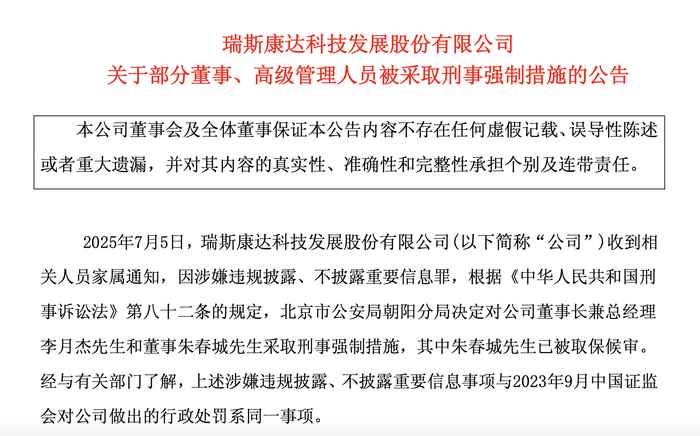 对于两人此次被采取刑事强制措施的具体原因,瑞斯康达在公告中称,涉嫌违规披露事项,与2023年9月证监会行政处罚系同一案件。