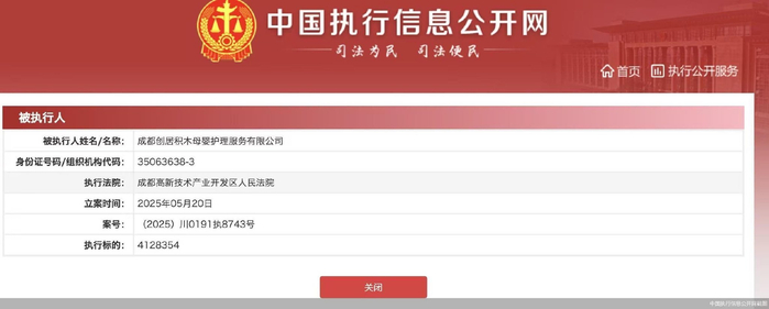 中国执行信息公开网显示,积木枝芽月子中心母公司成都创居积木母婴护理服务有限公司,在今年5月20日被列为失信被执行人,执行标的超412万元。北京商报记者向积木枝芽月子中心发送了采访提纲,并多次致电,但截至发稿暂未得到回复。